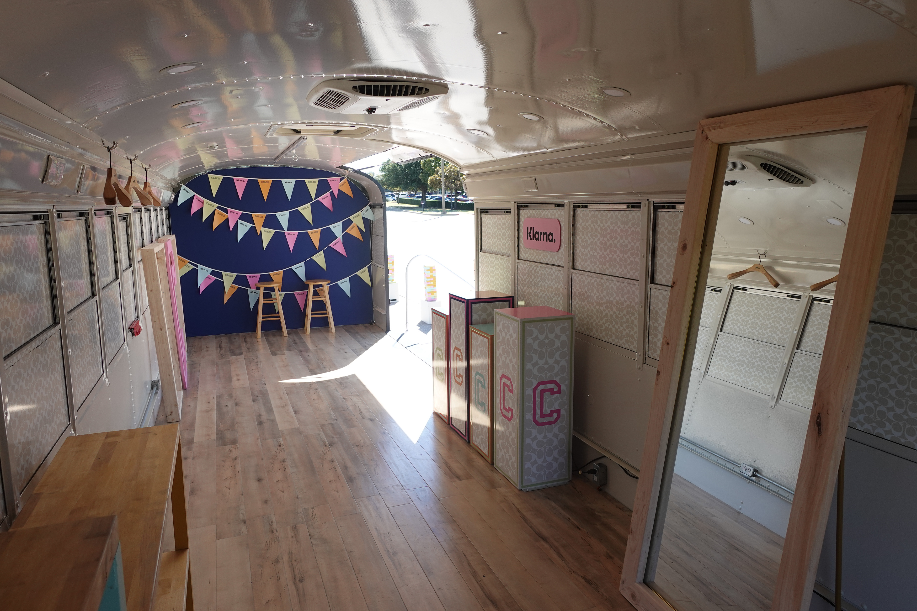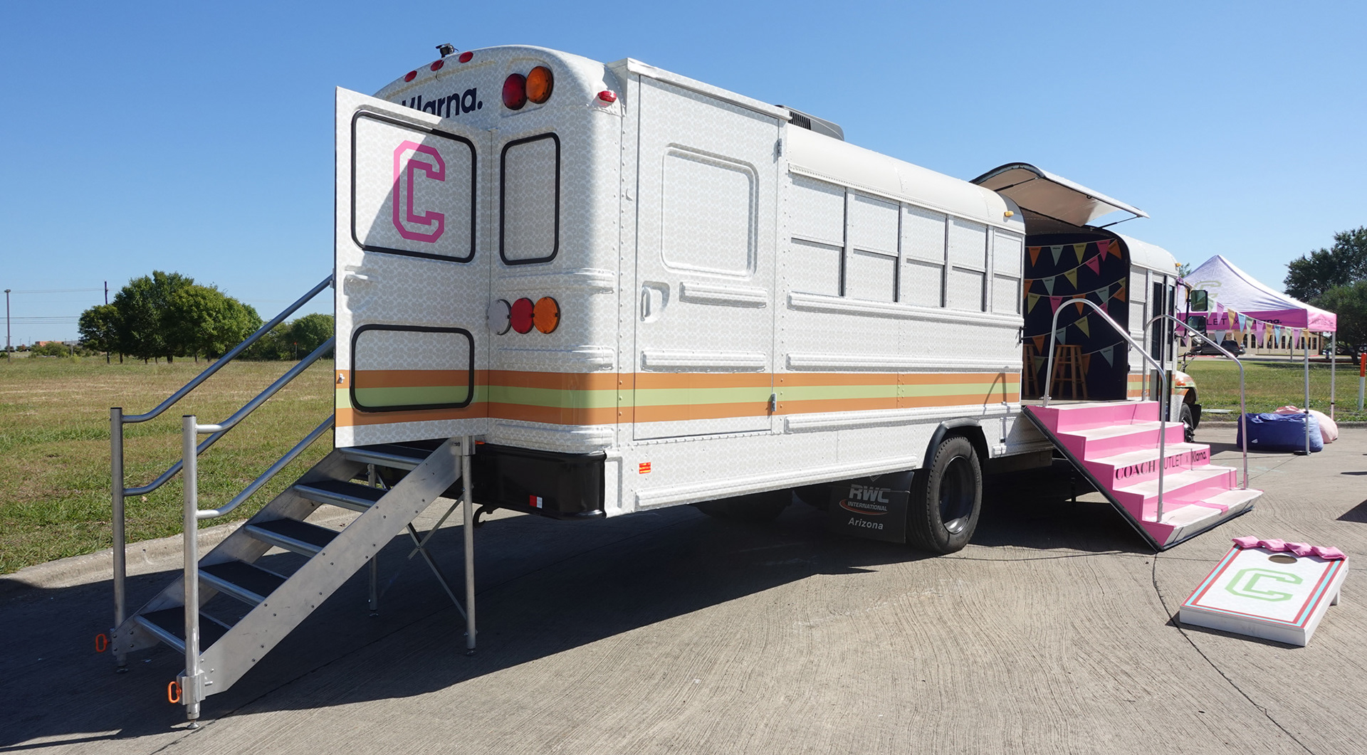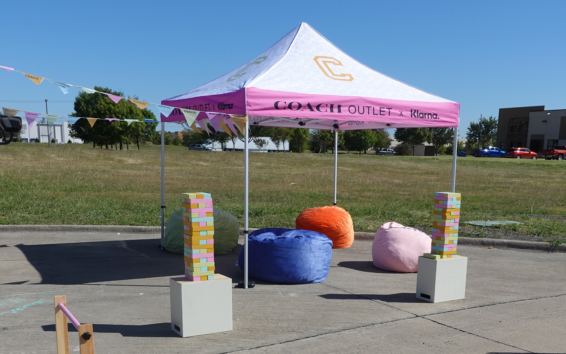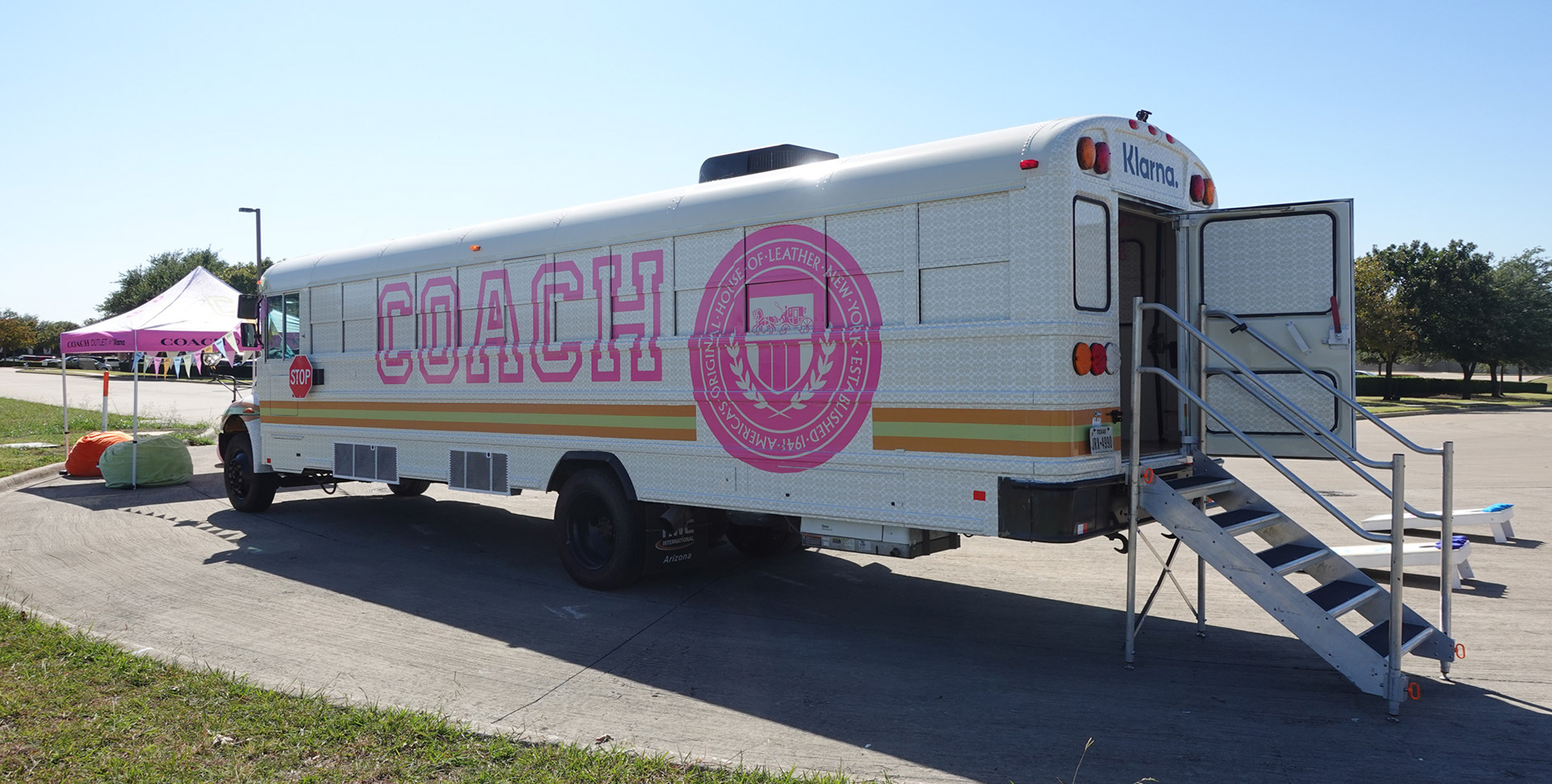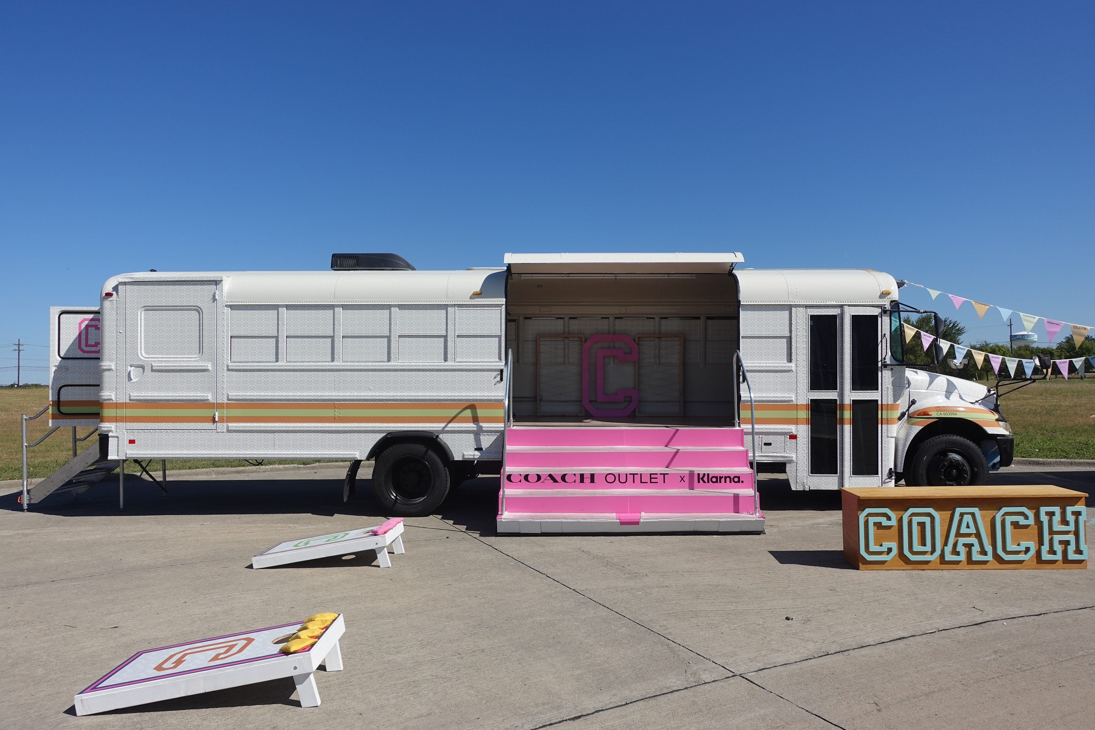 Design & file production for Coach x Klarna pop-up event featuring a wrapped school bus, tent, pillars, corn hole, & more. Note: there is production material on the tops of the pink steps that make the text appear uncentered, but it's not!