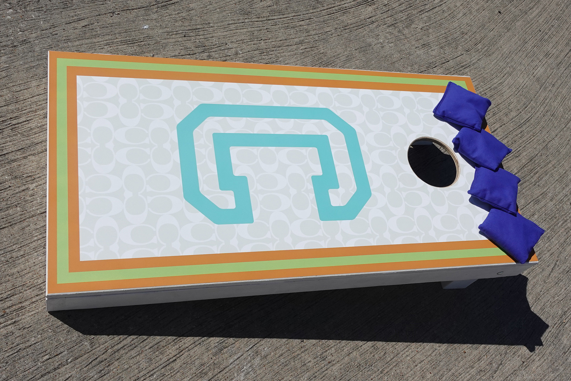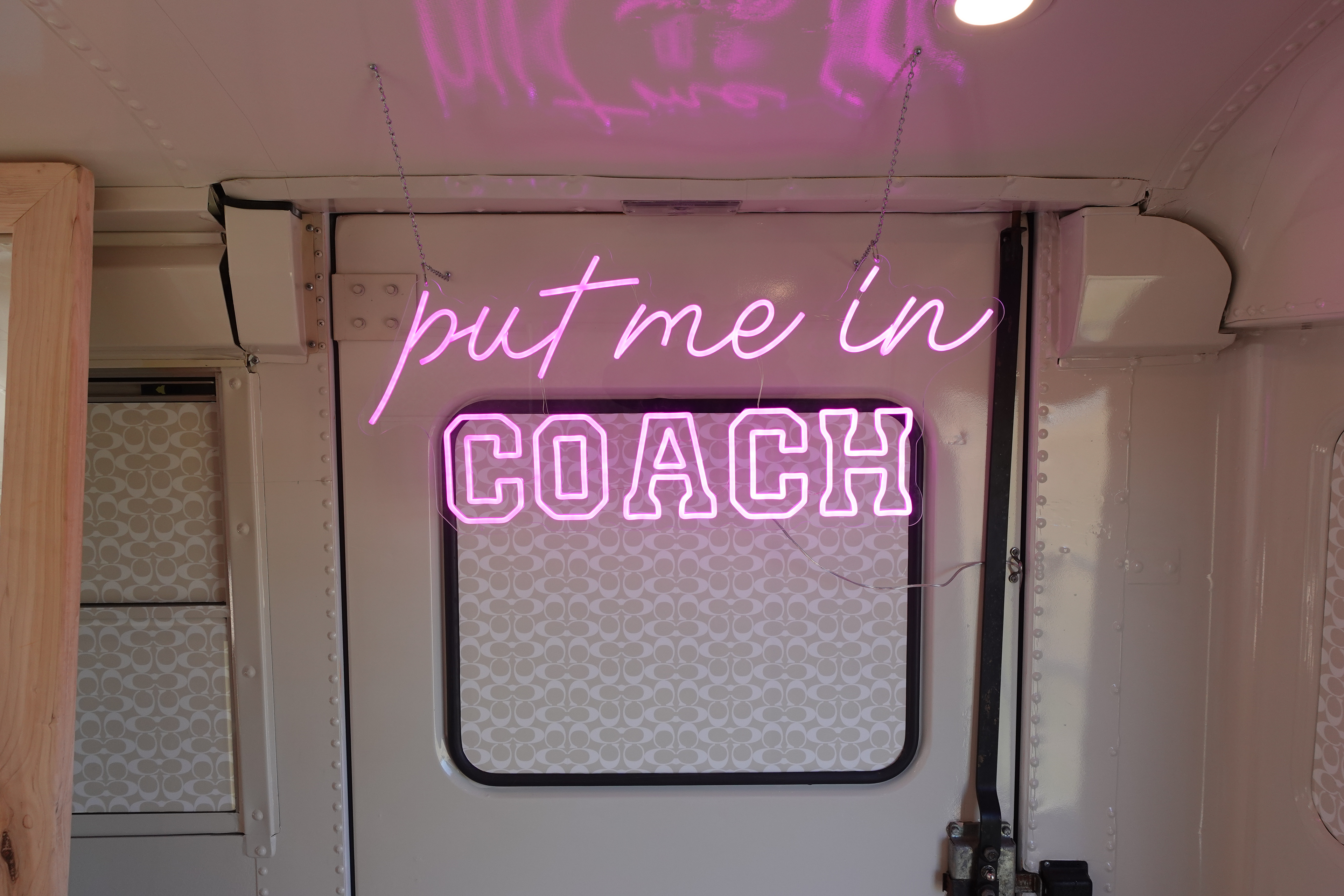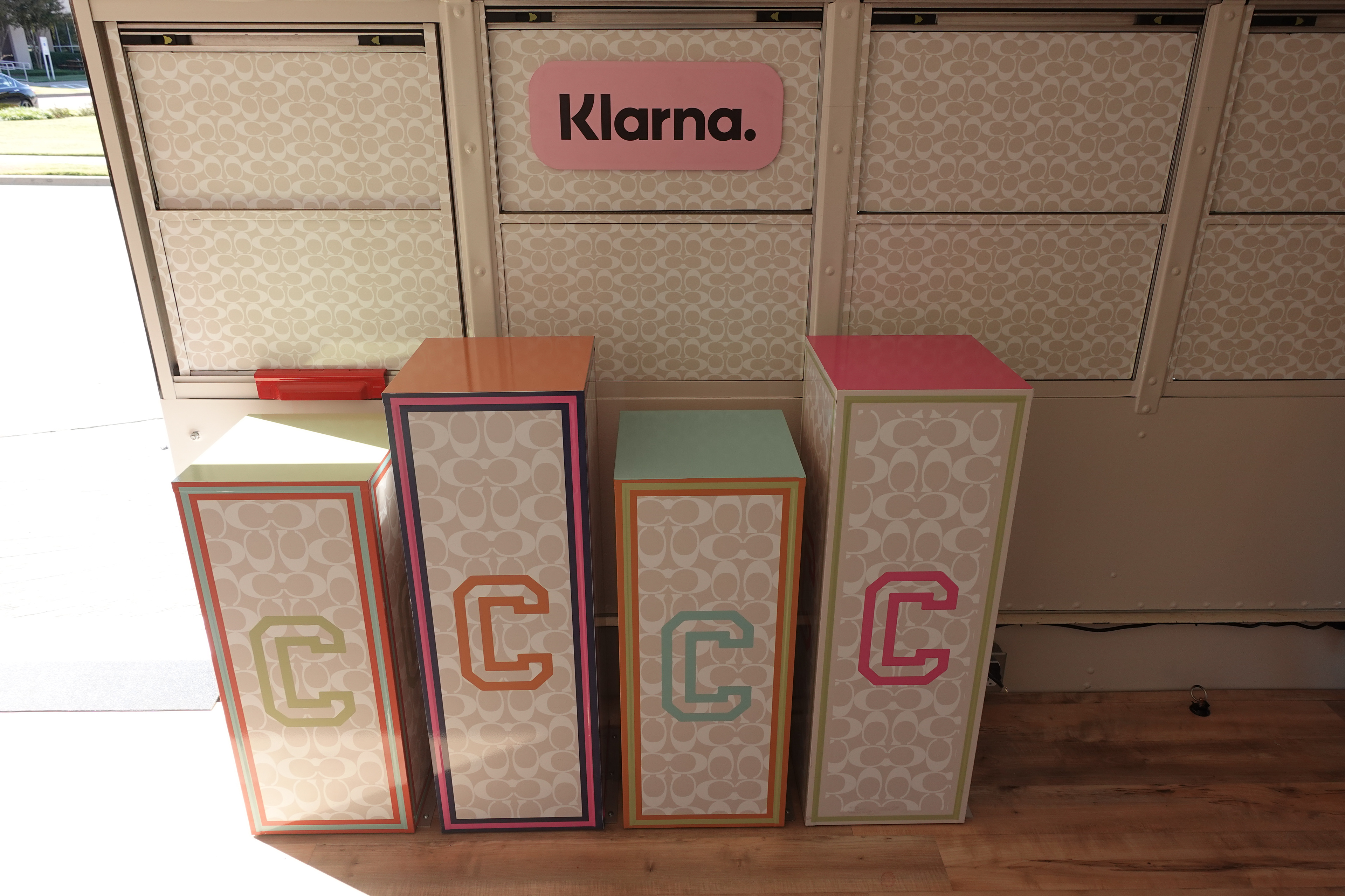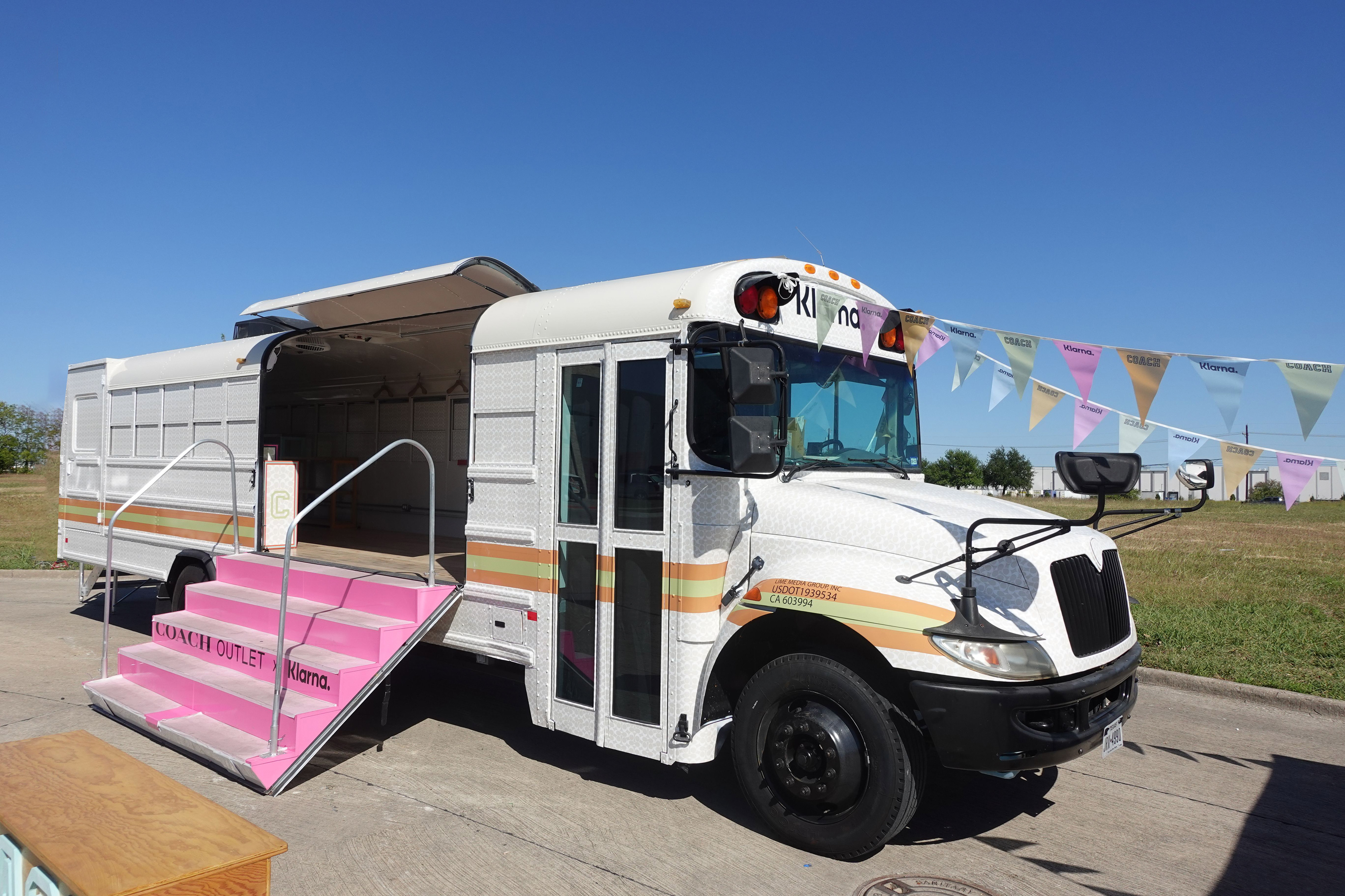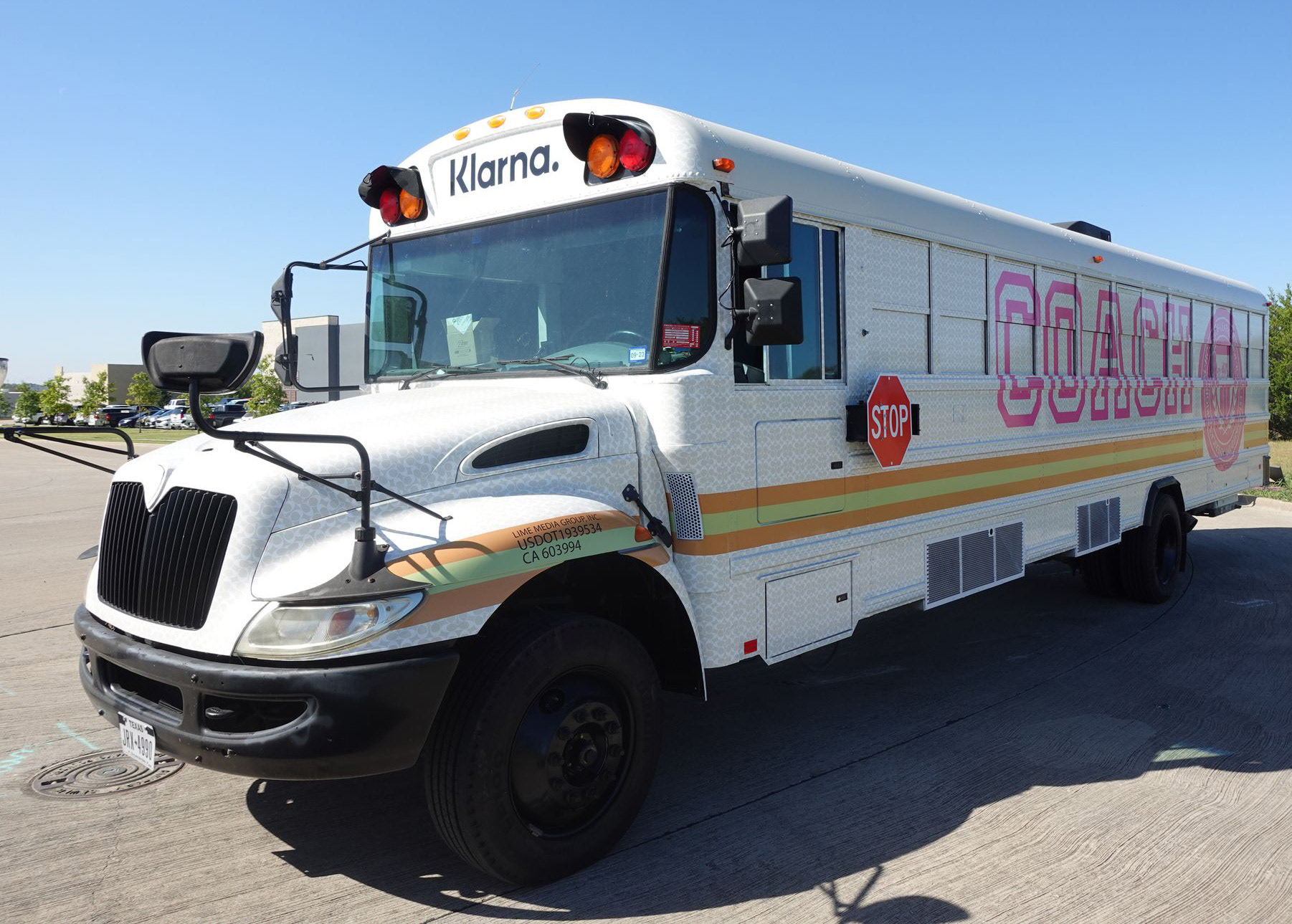 Design & file production for Coach x Klarna pop-up event featuring a wrapped school bus, tent, pillars, corn hole, & more. Note: there is production material on the tops of the pink steps that make the text appear uncentered, but it's not!
