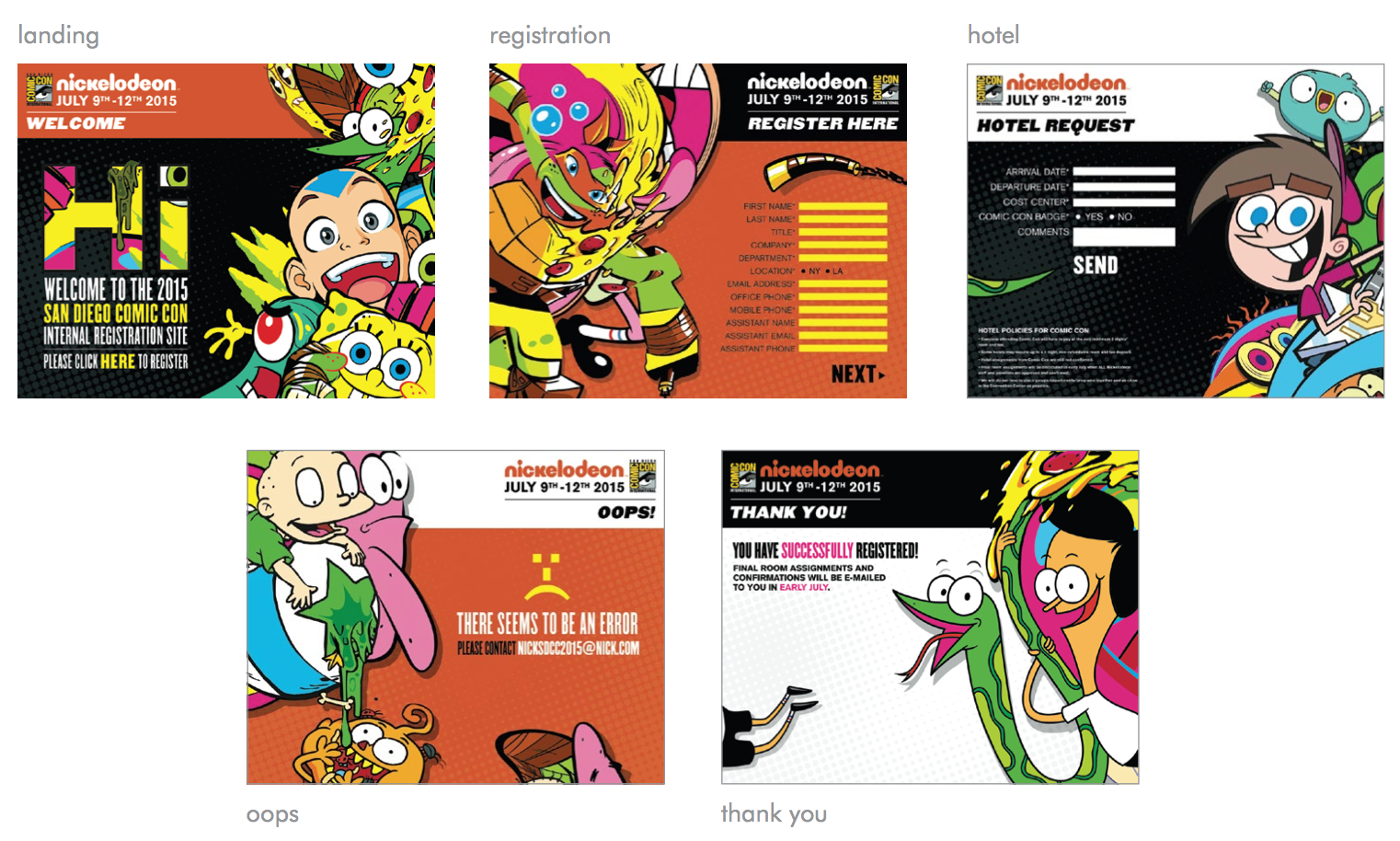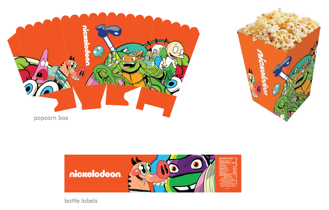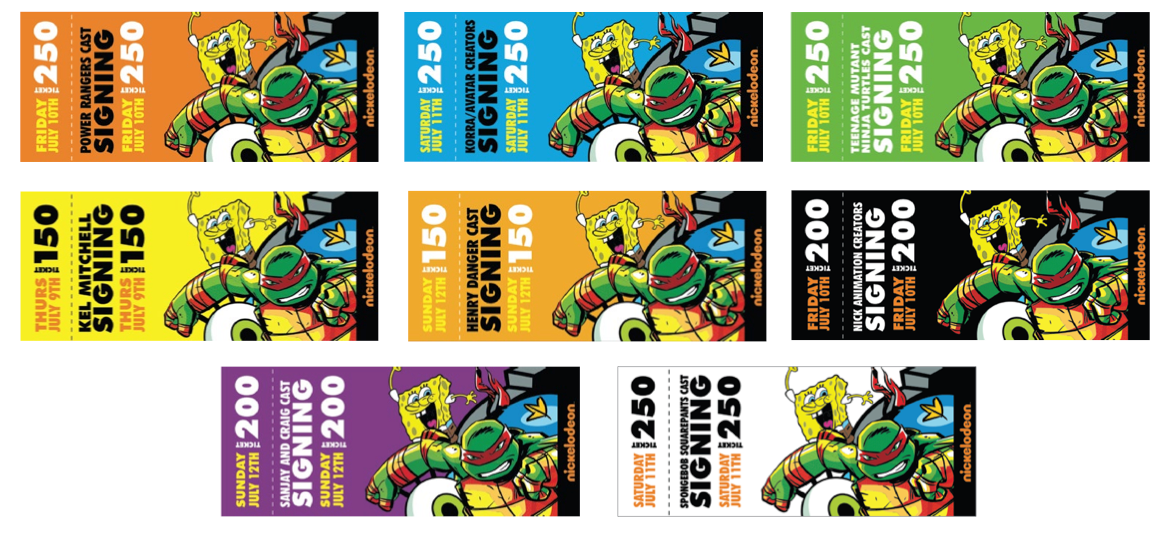 Booth design and all related collateral that I worked on as Senior Designer for Nickelodeon's 2015 San Diego Comic Con presence (with CD Chris Groll, AD Oona Stern, and Senior Designer Beau Walters). The initial stages involved developing mood boards and deciding on booth shapes/styles that would create an energetic space. Once that was determined I did several rounds of 2D renderings until the desired look was achieved and rolled out across the presence. Collateral included registration website, staff shirts, signs, food and beverage labels, credentials, power point screens, schedule cards, retail product cards/signs, raffle tickets, talent signing tickets, and more.